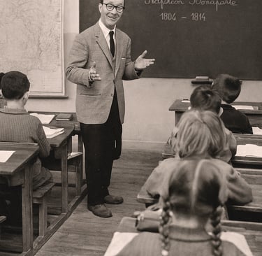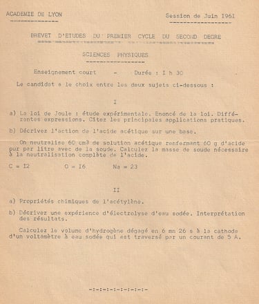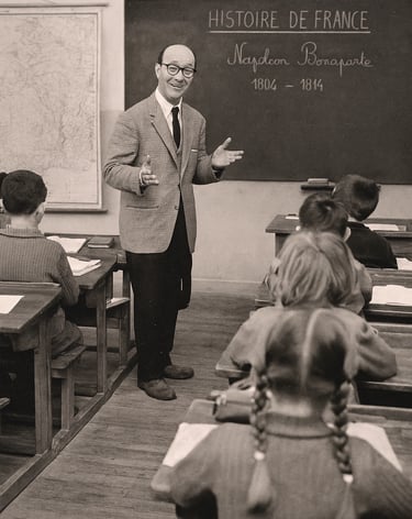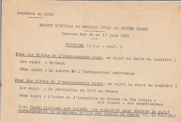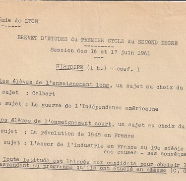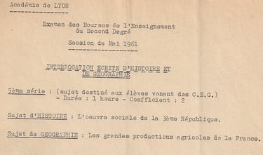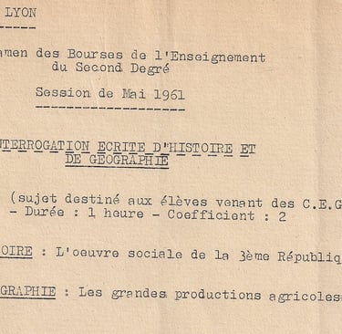Histoire et géographie : Monsieur Foyatier, le directeur de l'école nous enseignait ces deux matières. L'histoire, il nous la racontait en déambulant dans les allées de la classe. Il nous captivait, c'était de l'histoire vivante qui se gravait facilement dans notre mémoire. Je n'apprenais que rarement mes leçons, mais j'obtenais néanmoins des notes plus que satisfaisantes.