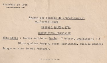 Français : je ressentais que monsieur Mazenod notre professeur de français ne m'aimais pas. Je ne me souviens d'aucun de ses cours. Ils ne devaient certainement pas être intéressants. Il passait son temps à parler, campé contre le rebord de la fenêtre une main dans la poche de son pantalon. Il se grattait sans arrêt. On se demandait tous qu'elle en était la raison. J'émis l'hypothèse qu'il avait de l'eczéma mal placé.