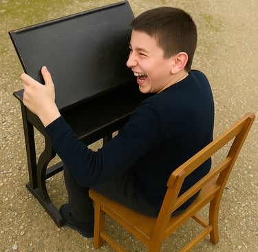 Nous avions des bureaux individuels en bois coloré en noir. La tablette où on écrivait se soulevait jusqu'à la verticale et laissait apparaître un coffre dans lequel on pouvait ranger livres et cahiers. J'étais assez dissipé en classe malgré mes bons résultats. Parfois avec certains de mes camarades plus ou moins éloignés de ma place, nous échangions des plaisanteries à voix basse, des gestes équivoques, des regards complices qui me faisaient pouffer d'un rire contenu, silencieux. Je me cachais derrière ma tablette de bureau soulevée afin que le professeur ne se doute de rien quant à ma dissipation.
